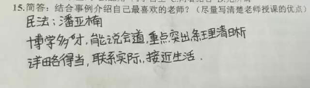 潘:我能说这是自带的效果吗?我觉得在讲台上不止要有严肃的一面,更多的可以把学生当作民法爱好者一样去用心交流,用轻松的语言举一些有趣的事例,多用启发性的设问,和学生轻松的互动。课堂偶尔聊一些关于社会、就业、恋爱的话题,其实也是在于给学生正面的引导。关注学生要求,教学资源师生共享,尽心帮助学生答疑解惑。备课、上课、回复学生的各种问题是我的工作常态。老师发自内心地爱学生,才有了学生对老师的信赖,老师的威信才会逐步确立。